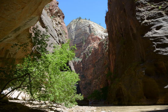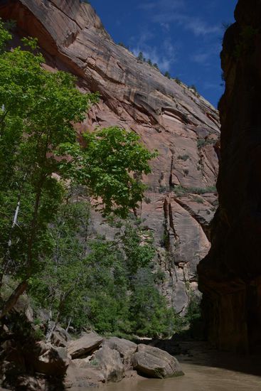 Mit dem kostenlosen Shuttle fahre ich bis an das Ende der Strasse dann geht es zu Fuss weiter. Ein kurzes Stueck auf einem befestigten Weg, dann im Flussbett und ueberwiegend im Wasser, dass nach dem gestrigen Regen mit Sedimenten gesaettigt ist und sich braun und undurchsichtig seinen Weg durch die Schlucht bahnt.