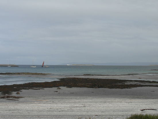 Aber von Anfang an: Wir machten diesen Ausflug alleine, nicht als Tour, hatten aber trotzdem eine Art Package gebucht, bei dem wir von einem Bus zur Fähre gebracht wurden. Ganz in der Nähe des Eyre Square fuhr der Bus ab, ein recht alter, klappriger Doppeldecker-Bus. Die Fahrt ging immer an der Bucht entlang bis nach Ros a'Mhíl, wo die Fähre schon wartete. Sie war darum schon recht voll, aber mich zog es sowieso sofort nach oben ins Freie. Meine Mutter, die unten bleiben wollte, fand noch einen freien Platz.