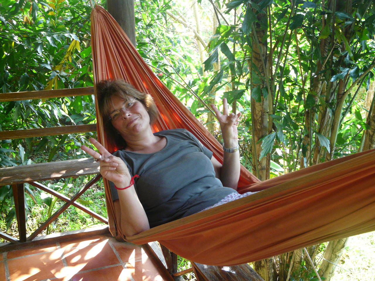 Ja, so ist das in Asien. Nachdem wir alle 6 Punkte abgearbeitet hatten, trat ich mit der Tuk-Tukmafia in Verhandlungen. Wir einigten uns nach längerem hin- und her auf einen Preis und los ging es. Der Tuk-Tukfahrer bog nach kurzem Intermezzo auf der staubigen Hauptsandpiste in eine kleine holprige Nebensandpiste ab. Dort ging es über Stock und Stein den Berg hoch und höher. Super, so richtig weit ab vom Schuss. Die Lodge stellte sich dann aber als kleines grünes üppig blühendes Paradies heraus. Kleine Bungalows versteckten sich in einem tropischen Garten. Und da wir ja am Hang lagen, hatten wir von hier oben sogar Meerblick.