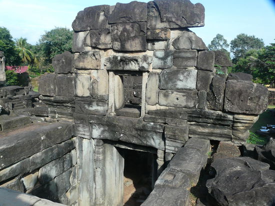 Aber zurück zum Banteay Srei Tempel. 30 Kilometer nordöstlich von Siem Reap gelegen, zieht er selbst Tempelmüde Besucher leicht in seinen Bann. Der aus feinkörnigem rötlichem Sandstein gebauten Tempel ist wie kein anderes Bauwerk Angkors  reich an aufwendigen und kunstvollen Verzierungen. Der Grundriss des Tempels ist relativ schlicht. Mit nur einer Ebene wirkt das Bauwerk im Vergleich zu den anderen Staatstempeln der Region geradezu winzig.