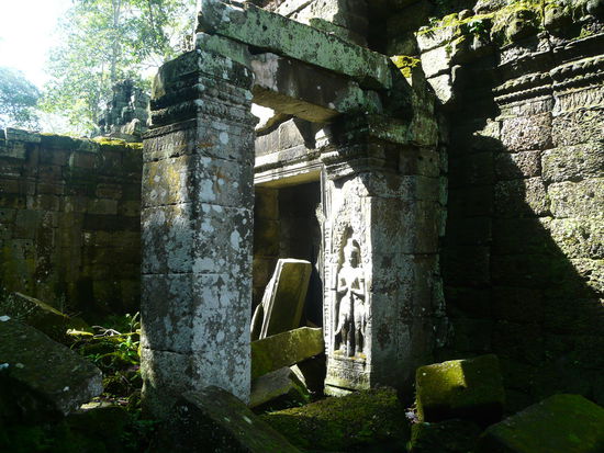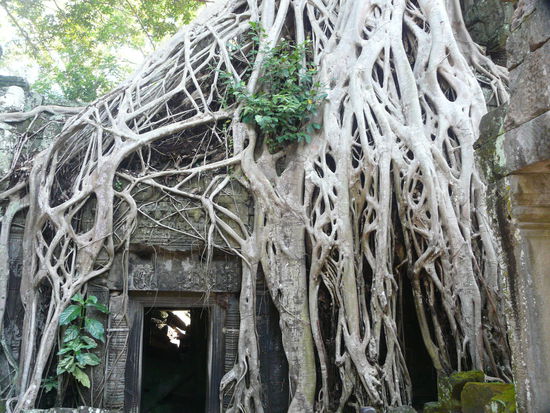 Da wir Angkor Wat ja schon am zweiten Tag einen außerplanmäßigen Besuch abgestattet haben, beginnen wir heute in Ta Prohm. Dem sogenannten Tomb Raider Tempel. Unser Tuk-Tukfahrer denkt mit und lässt uns am Osttor raus. Da ist das Licht besser zum Fotografieren und die Massen wälzen sich durch das Westtor durch den Tempel, so dass wir wieder etwas gegen den Strom schwimmen können. Trotzdem ist es natürlich voll, denn Ta Prohm gilt als einer der Hauptattraktionen des Angkorbesuches. Ein verwunschener Ort mit tollen Lichtspielen, die durch riesige Würgefeigen, verbreiten werden, abgesehen von den tausend schnatternden Koreanern, die wie die Lemminge ihren Guides hinterher laufen, eine tolle Atmosphäre. Große Teile des Tempels sind zerfallen und von der Natur zurück erobert worden. Verschiedene Bauwerke sind im festen Würgegriff der Bäume gefangen. Was den Bauwerken ganz sicher nicht gut tut, dem begeisterten Touristen aber Rufe des Erstaunens entlockt. Und so fotografiere ich mir morgens schon die Finger wund. Erste Rauchschwaden steigen aus meinem kleinen Apparat empor. Nach 2 Stunden verlassen wir wiederwillig diesen tollen Ort, mit inzwischen gefühlten fünftausend Koreanern an unserer Seite.