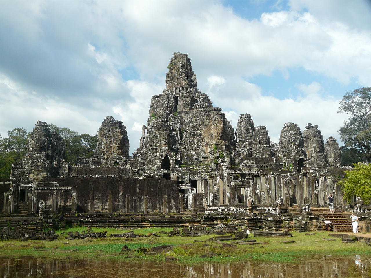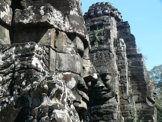 Weiter geht es zum sogenannten Bayon, eines der Hauptheiligtümer in der alten Stadt Angkor Thom. Leider erreichen wir diesen Tempel in der brennenden Mittagshitze. Nicht gut. Erstens kein Schatten, zweitens viel zu grelles Licht um gute Bilder machen zu können. Vorteil: die meisten Tempelbesucher sind müde und machen Mittagspause. So haben wir diesen Tempel fast für uns. Was nach dem Gedränge in Ta Prohm eine Wohltat ist.