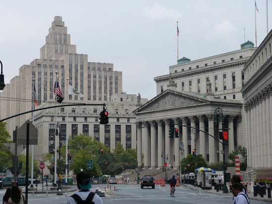 Durch das Bankenviertel Manhattans geht es weiter nach Westen am neuen World Trade Center vorbei, dem mit 541 Metern höchsten Gebäude der USA und dem 4. höchsten Gebäude der Welt. Es ist zwar wirklich beeindruckend, doch direkt ran kommt man nicht und so verliert auch dieser Wolkenkratzer einen Teil seiner Imposanz im dichten Hochhausjungel von Downtown. An der Promenade des Hudsonrivers haben wir dann einen tollen Blick auf Jersey City, das nur wenige und halb so hohe Wolkenkratzer zu bieten hat, die aber durch ihren isolierten Stand wesentlich besser zur Geltung kommen. Auch wenn es noch schön warm ist, treibt uns der Regen zurück in Richtung Chinatown, um die Rucksäcke mit Kamera und Notebook ins trockene Hotel zu bringen.