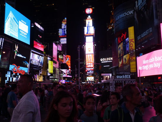 Über eine Stunde genießen wir die atemberaubende Aussicht und den Wind der grenzenlosen Freiheit, der uns in dieser Höhe durch die Haare weht, bevor wir diesen sorgenfreien Ort verlassen und wieder in den Trubel des New Yorker Alltags tauchen. Es geht weiter zum Time Square, dem angeblichen Herzen Manhattans. Seit unserer Ankunft haben wir nach den unglaublichen Menschenmassen gesucht, die so charakteristisch für diese Stadt sein sollen. Endlich haben wir sie gefunden. Hunderte Menschen Strömen von allen Seiten zum Times Square und verschwinden wieder in irgendeiner Seitenstraße. An sich ist es ein eher kleiner Platz, doch das hektische Blinken und Aufleuchten der vielen riesigen Werbetafeln droht einen schier zu erdrücken und wir beschließen, auf jeden Fall noch einmal in der Dunkelheit wiederzukommen. Ein New York Besuch ist schließlich kein New York Besuch, ohne den Times Square by night.