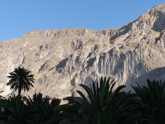 Im oberen Teil des Canyons tauchen dann plötzlich doch noch zwei Schatten vor der Sonne auf. Der Bus macht eine Vollbremsung, wir strömen mit Kameras bewaffnet nach draußen und knippsen eifrig die beiden Flattermänner. Hmm, sind eben auch nur große Greifvögel, die da über uns in der Luft ihre Kreise ziehen. Hätte man sich die Aufregung auch sparen können. Immerhin können wir nun sagen, schon mal einen Kondor in freier Wildbahn gesehen zu haben.