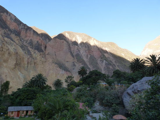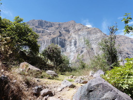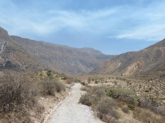 Der Weg läuft sich sehr schön auf der grünen Seite des Colca Canyons, wo die Einheimischen dank eines groß angelegten Bewässerungssystems Avocados, Mangos, Feigen und alle möglichen anderen Früchte- und Gemüsesorten anbauen. Links von uns fällt der Weg immer mal wieder steil nach unten ab, wo sich hundert Meter tiefer der Bach durch die Talsohle schlängelt.