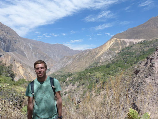 Über eine Staubstraße folgen wir dem Canyon bis zum Kondoraussichtspunkt, wo man mit hunderten anderen Touristen nach Kondoren Ausschau halten darf. Leider zeigt sich heute kein einziger der Riesenvögel und so haben wir volle 50 Minuten Zeit, uns den Canyon anzusehen. Nach Wochen im Hochland der Anden für uns weniger abwechslungsreich und spektakulär als erwartet. Natürlich ganz nett anzusehen und es geht vor uns auch ziemlich tief runter ins Tal, aber eben nicht sooo großartig. Faszinierend ist dafür, wie unfassbar viele deutsche Touristen man hier im Canyon antrifft.