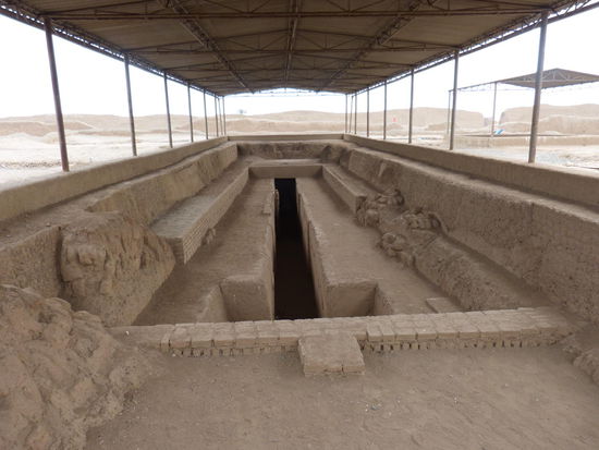 Wir halten noch kurz an einem anderen Lehmtempel, dem Huaca del Dragon bzw. Huaca del Arco Iris, der von unfassbar massiven und schön verzierten Lehmmauern umgeben ist, bevor es dann zur eigentlichen Attraktion des Tages geht, der Lehmstadt Chan Chan. Die um 1300 nach Christus entstandene Hauptstadt des Chimu-Reiches war zur damaligen Zeit die vermutlich größte Stadt Südamerikas, heute ist sie stark vom Klimawandel und der damit einhergehenden lokalen Niederschlagszunahme bedroht. Es ist wirklich schade, wie auf dieser riesigen Fläche von den meisten damaligen Bauten nur noch verwaschene Lehmhügel übrig sind. Immerhin das Zentrum der damaligen Großstadt ist noch halbwegs gut erhalten und dank aufwendiger Restaurierungsarbeiten ist es einem leicht möglich, sich in den früheren Alltag der Leute hineinzuversetzen. Für uns ist es vor allem deshalb sehr schön anzusehen, weil es nach den vielen ähnlichen Ruinen der Inkakultur und den vielen Stadtzentren aus der Kolonialzeit mal wieder etwas vollkommen anderes ist. Und uralte, dicke, über vier Meter hohe Lehmmauern sind sowieso immer beeindruckend. Leider stören auch hier die vielen Wellblechüberdachungen das Fotopanorama.