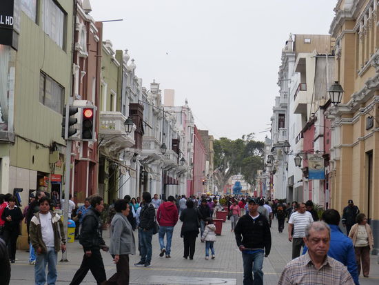Zu Fuß geht es dann den ganzen Weg, den wir schon mit Gepäck hierher gelaufen sind, wieder zurück, in die Altstadt von Trujillo. Auch hier gibt es einen sehr schönen Plaza de Armas. Nicht ganz so imposant aber dafür viel bunter als in Arequipa und fast schon karibisch bzw. orientalisch. Auch die wenigen Bäume und Palmen sind hier nicht so groß und dicht, weshalb man ein viel freieres Raumgefühl hat und die bunten Kolonialbauten erst so richtig zur Geltung kommen.