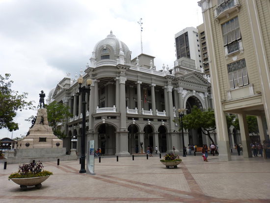 So geht es zu Fuß los, die Gegend erkunden. Die unfreundliche Dame an der Rezeption erklärt uns sogar widererwartend, wo sich der nächste Supermarkt befindet. Es gibt einen ganz netten grünen Platz, dem Plaza del Centenario, gleich in der Nähe, von dem wir dann über die Straße des 9. Oktobers, sozusagen dem Kudamm Guayaquils, bis zur Uferpromenade kommen. Der dreckige, unschöne Eindruck, den wir zuerst hatten, wandelt sich hier in ein nettes, geschäftiges Großstadtfeeling um. Hübsche Kolonialbauten stehen zwischen unzähligen Wohnhochhäusern, in deren Erdgeschossen sich Klamottengeschäfte, Krimskrams- (auch hier hält die Weihnachtsstimmung bereits Einzug) und Fastfoodläden und Kinos und Banken angesiedelt haben. Sogar das 25 US-Cent billige Limettenwassereis, dem wir schon in Cuenca verfallen sind, gibt es hier. Die Promenade wollen wir uns aber für morgen aufheben und so geht es nach einem kurzen Stopp in einem Burgerrestaurant in den besagten Supermarkt. Sehr schön, dass die Geschäfte hier auch sonntags aufhaben, weniger schön, dass sonntags hier kein Alkohol verkauft werden darf, was unsere Abendplanung schon wieder durcheinander bringt. Doch der Besuch in einem kleinen Privatladen, dessen Besitzerin genauso wenig von dem Gesetz zu halten scheint wie wir, kann auch dieses Problem aus der Welt schaffen.