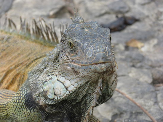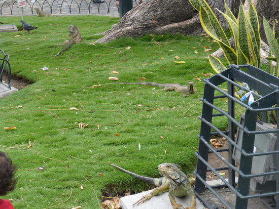 Der Stadtbummel beginnt mit einer ausgiebigen Leguanfotosession. Dutzende von den mit Schwanz ganz locker über einen halben Meter großen Tieren laufen hier in einem kleinen Park frei herum. Im Hintergrund des Parks, auf der anderen Straßenseite, prunkt die Silhouette einer gelben Kathedrale.