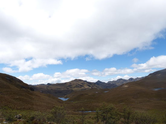 Nachdem wir die Stadt Cuenca schon für europäisch gehalten haben, ist es mit der Landschaft kaum anders. Saftig grüne Almwiesen säumen die Berghänge des schmalen Tals, durch welches sich unsere Straße immer weiter in die Höhe windet. Auf über 3000 Metern wird dann die Vegetation immer lichter, bis schließlich nur noch Büsche und Gräser das Hochland mit seinen vielen kleinen Seen und Tümpeln zieren.