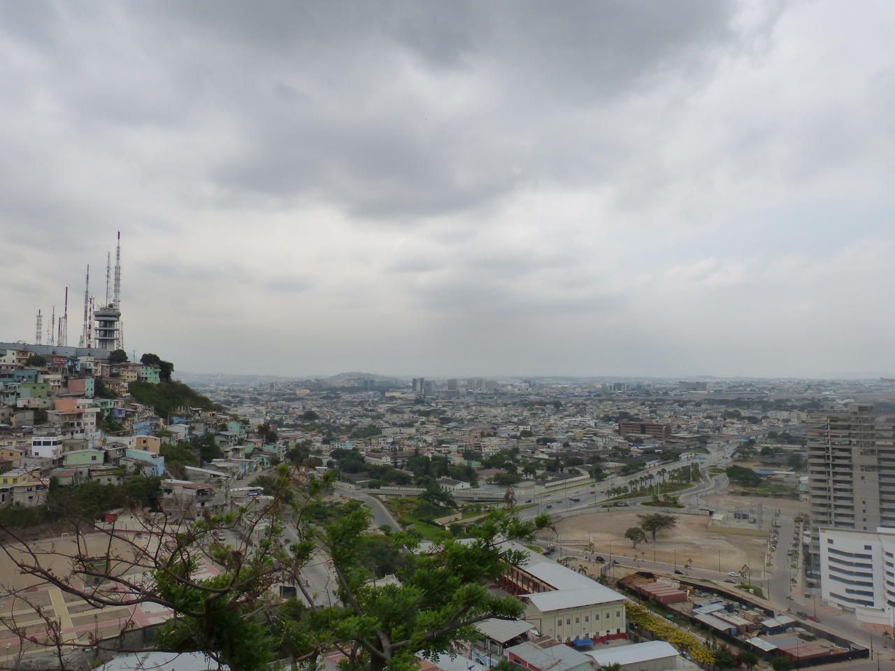 Immerhin ist die Landschaft weiterhin schön grün, richtig tropisch. Bananen- und Kakaoplantagen prägen den Blick aus dem regennassen Busfenster und kleine Bauerndörfer ziehen an uns vorbei. Nach dreieinhalb Stunden Fahrt erreichen wir dann Guayaquil. Es hat aufgehört zu regnen und bei schwülwarmen 30°C zeigt sich sogar ab und zu die Sonne zwischen den Wolken.