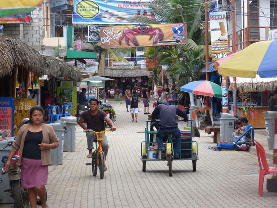 Heute ist also schon Freitag und man könnte annehmen, abends ist hier etwas mehr los als die letzten Tage. Also beschließen wir, noch eine weitere Nacht zu verlängern und erst morgen Richtung Norden aufzubrechen. Wie erwartet verbringen wir auch heute wieder die meiste Zeit des Tages mit essen, baden und schlafen, bevor es dann nachmittags mit dem Fotoapparat bewaffnet noch mal zu Fuß durch den Ort geht. Eigentlich wollten wir auf Sonnenschein warten, damit die Fotos freundlicher wirken, aber da kann man hier vermutlich warten, bis der Arzt kommt. Viel zu fotografieren gibt es in dem kleinen Örtchen auch gar nicht, weil sich die zwei, drei Touristenstraßenzüge mit den ganzen Hotels, Bars, Restaurants und Burgerständen kaum unterscheiden und man die anderen Straßen gar nicht auf einem Foto verewigen will.