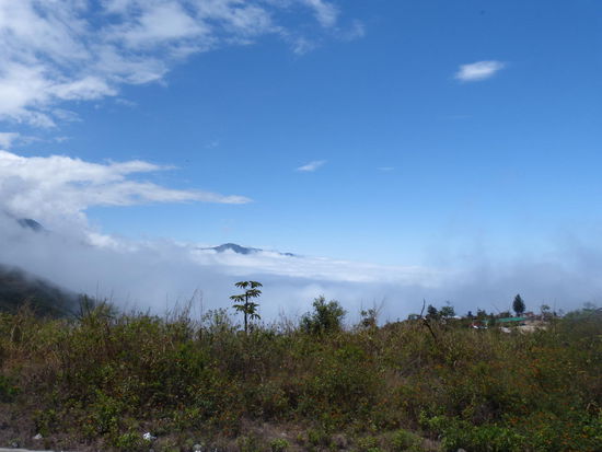 Nach über einer Stunde haben wir auf ca. 4000 Metern den höchsten Punkt erreicht und von nun an geht es bis ins fast auf Meeresniveau liegende Guayaquil nur noch bergab. Wenig verheißungsvoll ist die dicke Wolkendecke, die unter uns den gesamten Himmel bis zum Horizont bedeckt. Und tatsächlich tauchen wir einige Minuten später mitten hinein in den trüben Nebeldunst, wo die Sicht weniger als 30 Meter beträgt und feiner Sprühniesel alles in triefende Nässe hüllt.