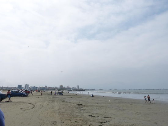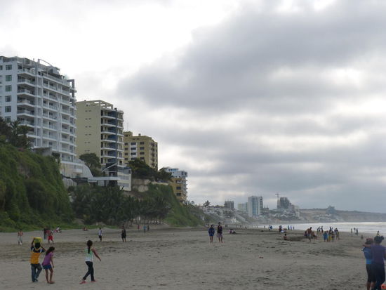 Nachdem wir den Strand stadteinwärts wieder verlassen haben, landen wir in einem Wohnviertel. Von Zentrum also auch hier keine Spur. Dafür ernten wir jede Menge neugieriger Blicke der Einheimischen. Es geht zurück, am Busbahnhof vorbei, die Küstenstraße entlang in die andere Richtung. Hier gibt es dann einen wirklich tollen Sandstrand und eine Promenade mit lauter Restaurants und netten Cafés. Hätten wir das früher gewusst, wären wir vermutlich auch noch mal baden gegangen. Nicht nur, dass der Pazifik hier nämlich wieder schön blau statt braun ist, die Sonne lässt sich anders als in Montanita bei schwülen knapp dreißig Grad auch immer mal wieder blicken.