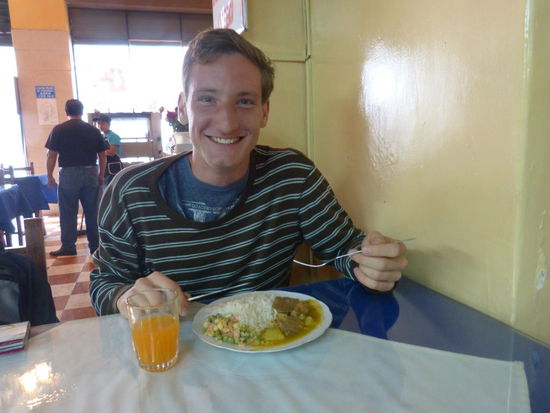 Dass es am Wochenende in unserem Hotel kein Frühstück gibt, kommt uns, nachdem wir erst irgendwann nach um drei ins Bett gegangen sind, sogar ganz gelegen. Für mich ist schon der Checkout um 12:30 Uhr zu früh. Aber hilft ja nichts. Wenn wir erst irgendwann spät abends in Manta ankommen, ist schließlich auch keinem geholfen. Also gibt es noch ein schnelles Mittagsmenü, bevor wir an der Hauptstraße auf den nächsten Bus warten. Der kommt auch wirklich schon nach zwei Minuten und die Frage "Manta?" beantwortet der fürs Abkassieren zuständige Ecuadorianer mit heftigem Nicken.