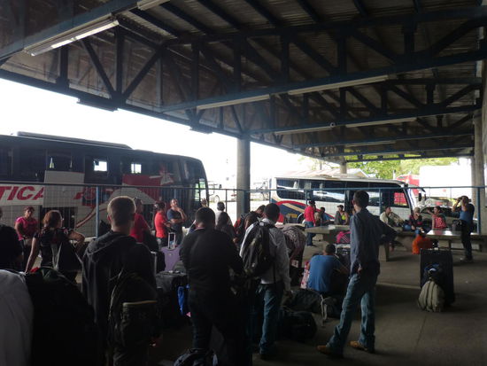 Mitten in der Nacht gibt es dann eine vollkommen unnötige Passkontrolle, bevor wir morgens nach acht Stunden Fahrt die Grenze erreichen. Die schlechte Organisation geht weiter. Nachdem wir alle bereits in der Schlange für den Ausreisestempel standen, müssen wir plötzlich alle unser Gepäck aus dem Bus holen und in einem kleinen Raum in Reihen aufstellen. Namen werden aufgerufen, manche müssen ihre Pässe vorzeigen und dann irgendwann kommt ein Grenzbeamter mit einem total putzigen Drogenhund herein und läuft durch unsere Gepäckreihen. Danach werden noch mal alle Namen aufgerufen, anscheinend fehlen zwei Leute aus unserem Bus, und dann wird das ganze Gepäck noch mal von Hand durchsucht. Bevor wir auf die costaricanische Seite laufen dürfen, stehen wir dann über eine halbe Stunde für den Ausreisestempel an.