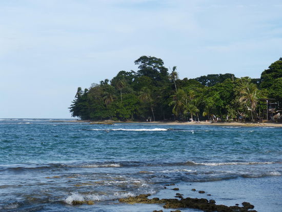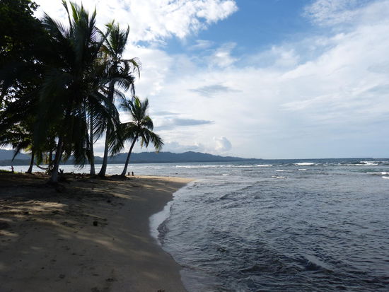 Statt einer Klimaanlage gibt es hier offene Fenster, was uns ganz Recht ist. Denn obwohl wir uns ja extra dick angezogen haben, sind wir dank der letzten Busfahrt etwas erkältet. Highlight der viereinhalbstündigen Fahrt ist ein Banane-Erdbeer-Papaya-Milchshake in Limon. Ursprünglich hatten wir diesen Ort als Ziel anvisiert, aber da es hier wohl ziemlich gefährlich sein soll, klangen die Berichte über das ca. 50 Kilometer südlich gelegene Puerto Viejo um einiges verheißungsvoller.
