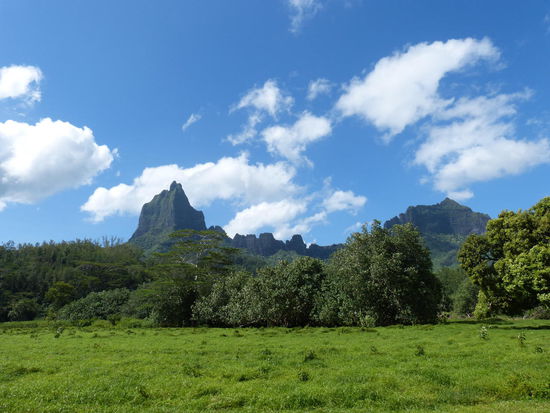 Genau an diesem Morgen sind die Baguettes in unserem kleinen Laden natürlich schon wieder ausverkauft, aber da wir eigentlich eh nur ein paar Früchte einsammeln wollen, geht es eben ohne Frühstück weiter. Am Ende der Opunohubay führt eine Straße ins Inselinnere zum Belvedere, einem Aussichtspunkt, von dem Renato uns erzählt hat. Der Weg ist an sich sehr schön; die Straße wenig befahren und die Vegetation um einen herum saftig und grün. Nur irgendwelche Pflanzen mit essbaren Früchten lassen, wenn man mal von hunderten unreifen Passionsfrüchten absieht, leider auf sich warten. Nach etwa zehn Kilometern erreichen wir dann das Ende der Straße: Belvedere. Die Aussicht ist wirklich großartig, wie sich die beiden Bays direkt vor uns, durch den Mount Rotui von einander getrennt, ins Inselinnere ziehen.