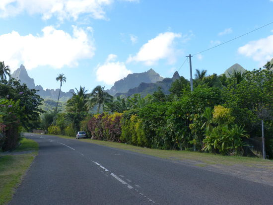 Auf der Küstenstraße, die auf ca. 60 km einmal um die gesamte Insel führt, geht es dann nach dem Geldabheben grundsätzlich zu Fuß zurück, wo wir auf halber Heimstrecke nach Paopao kommen. Hier gibt es gleich zwei größere Supermärkte, die uns mit allem versorgen, was über die Grundsachen hinausgeht und wesentlich billiger ist, als in dem kleinen Markt bei uns um die Ecke.