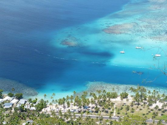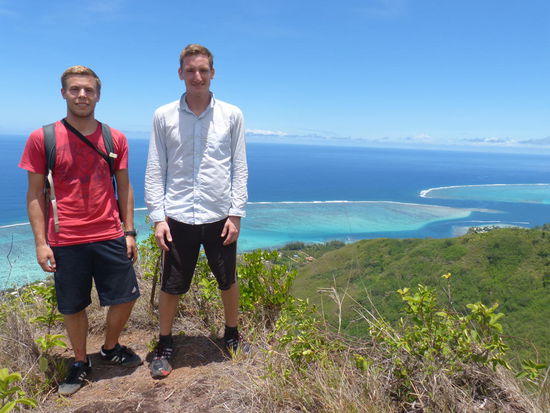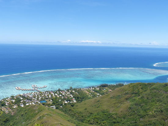Gelohnt hat sich der Aufstieg für dieses fantastische Panorama auf jeden Fall. Zu unserer Rechten ragen tief unter uns die Bungalows des Hiltons in das helle, türkisfarbene Wasser hinein. Vor uns, in mehreren hundert Metern Entfernung vom Ufer, brechen die großen Wellen des offenen Pazifik an der Außenriffkante, bevor sich ihre unglaubliche Kraft im flachen Wasser der Lagune an den vielen kleinen Koralleninseln verliert und sie schließlich als seichte Wogen den Strand erreichen. Zu unserer Linken reicht der Arm der Opunohubay in das Landesinnere hinein. Dazu stellt man sich die Form von Moorea am besten als großes Herz vor. An der Stelle, wo die beiden Bogen zusammenführen, ragt jedoch noch ein dicker Stängel heraus (die Aorta wenn man es so will). Dieses rausragende Stück wird von der Cookbay mit dem Örtchen Paopao am Ende zur einen und von der Opunohubay zur anderen Seite umgeben ist. An der Spitze des Stängels befinden sich unsere Unterkunft und auch der Aussichtspunkt auf dem wir gerade stehen.
