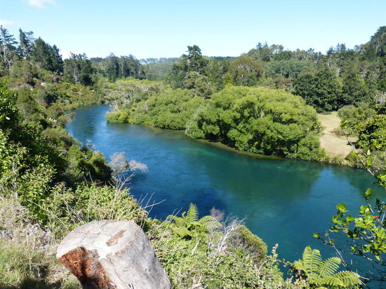 Die andere Seite des Sees in näherer Umgebung westlich von Taupo ist jetzt auch nicht so sensationell und so geht es mit vollen Einkaufstüten zurück zum Zeltplatz, im Fluss baden. Durch mehrere heiße Quellen, die den riesigen Lake Taupo, den größten See Neuseelands, speisen, ist das Flusswasser weniger kalt als erwartet. Und wenn man versucht, gegen die starke Strömung zu schwimmen, dann hat man sowie keinen Gedanken für etwas anderes übrig.