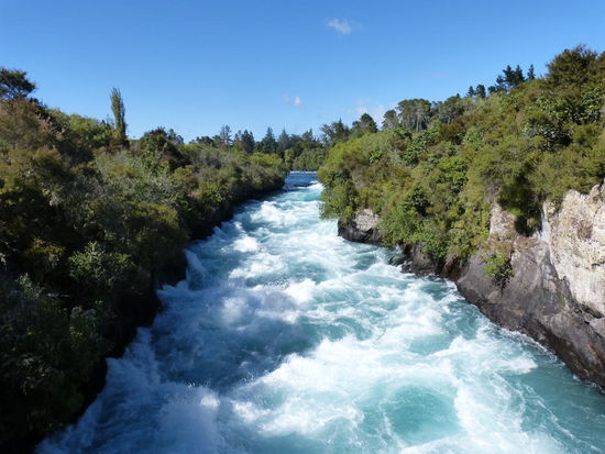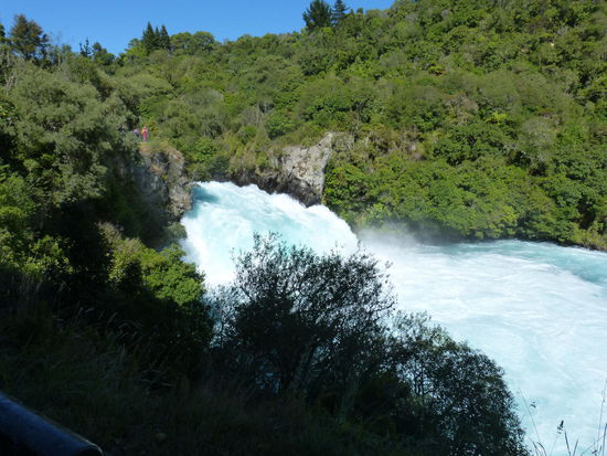 Gleich nach dem Aufstehen geht es zu Fuß zu den Hukafalls, die zwar nicht durch ihre Höhe, aber durch ihre unglaubliche Durchflussmenge beeindrucken können. Der Fluss schießt hier mit unglaublicher Geschwindigkeit durch eine eingeengte Felsformation, bevor sich dann das weißsprudelnde Wasser in die Tiefe ergießt. Auf der anderen Seite des Flusses führt ein schöner Pfad durch die mehr oder weniger ursprüngliche Natur erst direkt am Ufer entlang, bevor er sich dann langsam aber stetig von diesem absetzt und man einen guten Blick nach unten hat, auf den weiter stromaufwärts fast noch ruhigen Fluss. Irgendwann kommt man dann an den heißen Quellen vorbei, bevor wir schließlich auf die Spa Road treffen, die wir stadteinwärts Richtung Countdown Supermarkt laufen. Auf dem Weg dorthin wird noch ein kurzer Stopp am Taupo-Bungeesprung-Center gemacht. 47 Meter kann man sich hier, nur von einem Bungeeseil gehalten, in die Tiefe stürzen. Klingt weniger hoch, als es in Wirklichkeit ist. Mal sehen, ob wir uns im Laufe der nächsten Tage noch trauen...