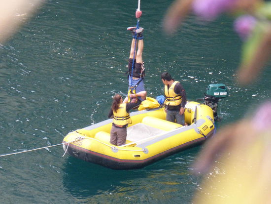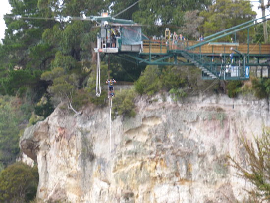 An sich ist es wirklich nicht in Worte zu fassen, was man in diesen Sekunden des freien Falls spürt. Es geht alles so schnell und ist einfach nur sooo krass, wie man mit unglaublicher Geschwindigkeit dem Wasser entgegen in die Tiefe rast, bevor das Seil die maximale Ausdehnung erreicht hat und man wieder in die Höhe zurückschnellt. Das ganze pendelt sich dann, mit jedem Mal schwächer werdend, ziemlich schnell aus und man wird unten von zwei Mitarbeiten ins Boot gelassen und an Land gefahren. Hätte ich gewusst, dass man den ganzen Weg wieder zu Fuß hochlaufen muss, hätte ich es mir vielleicht auch zweimal überlegt, so ist es einfach nur ein unglaubliches, aufgeregtes Glücksgefühl, das den gesamten Körper durchströmt. Nachdem Marc gesehen hat, wie viel Überwindung es letztlich doch kostet, ist bei ihm die Lust verflogen und so machen wir uns in Richtung Bibliothek auf, wo wir bei kostenlosem Internet unsere weitere Reise durch Neuseeland planen.