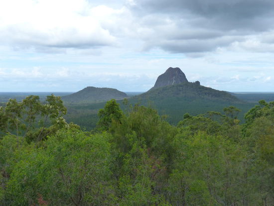 Nach der Frühstückspause zwischen hungrigen Möwen und ohrenbetäubendlaut schreienden Kakadus geht es zurück auf den M1 und darüber hinaus zu den Glashouse Mountains, weiter landeinwärts. Leider zieht ausgerechnet oben beim Lookout der Himmel zu und ohne Sonne wirkt das ganze Panorama wie immer nur halb so beeindruckend. Einen Ausflug wert ist es auf jeden Fall trotzdem. Es ist erstaunlich, wie grün Australien doch ist. Wir hatten eigentlich gedacht, zu dieser Jahreszeit müsste alles gelb, braun und verdorrt sein. Doch auch wenn man an jedem zweiten Baum irgendwelche schwarz verkohlten Stellen längst vergangener Waldbrände ausmachen kann, prägen die grünen Eukalyptusbäume das Land. Pinien gibt es hier übrigens auch, aber zum Glück nicht so viele wie in Neuseeland.