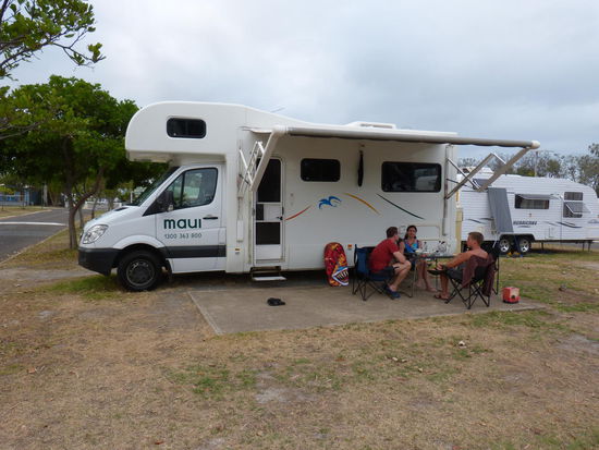 Die Australier mögen viele Sachen gut können, aber Ortschaften, Strände, oder was auch immer gut ausschildern gehört leider nicht dazu. Na ja, irgendwann nach einigem Umherkurven, Wenden, wieder Umherkurven und noch mal Wenden ist der Zeltplatz dann auch gefunden. Irgendwie hatten wir uns die Zeltplätze in Australien etwas weitläufiger und damit auch privater vorgestellt, aber gut. Dicht an dicht gedrängte Wohnwagen hin oder her, der Strand hier ist wirklich schön hier und super zum Badengehen.