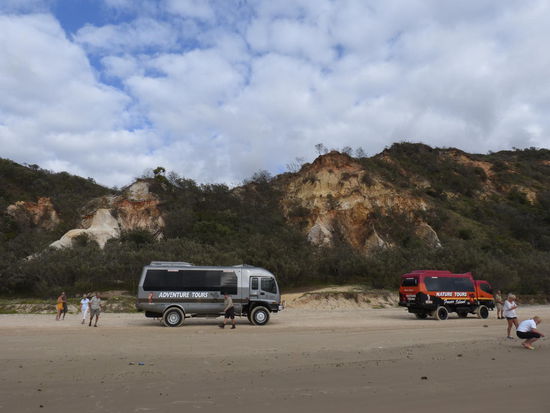 Knapp 100€ p.P. kostet unsere eintägige Tour, Abholung vom Campingplatz inklusive. In einem monstertruckähnlichen Bus geht es mit einem knappen Dutzend anderer Touristen zu einer kleinen Fährstelle, bevor es das erste Mal am Strand entlang geht. Wir sitzen natürlich ganz hinten im Bus, weshalb wir bei jeder Unebenheit im Sand einen halben Meter im Sitz nach oben springen, aber immerhin gibt es Gurte. Fast zwei Stunden geht es am weißen Strand entlang, bevor wir mit einer weiteren Fähre nach Fraser Island, der weltgrößten Sandinsel, übersetzen.