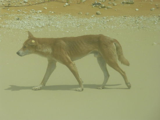 Sonnenschein ist an sich zwar sehr schön, ohne Sonnenbrille ist es am hellen Sandstrand aber unfassbar grell, weshalb ich auf den Fotos mal wieder aussehe wie ein Asiate. Zum Morgenkaffee am Strand gibt es noch eine große Packung Cookies, als es auch schon gleich wieder weitergeht. Kurz bevor wir ins Inselinnere einbiegen, streifen dann noch ein paar gelangweilte Dingos um den Bus herum und posieren für die Kameras. Dass diese abgemagerten Hunde, wie in unserem Reiseführer beschrieben, hier schon Menschen getötet haben sollen, kann man sich ehrlich gesagt schwer vorstellen.