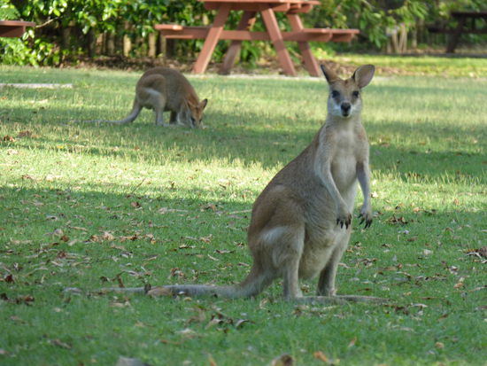 Die nächsten beiden Tage werden eigentlich nur mit Autofahren verbracht. Der Motorway 1 ist inzwischen auch nichts weiter als eine normale Landstraße, die sich zwischenzeitlich immer wieder durch hunderte überfahrene Kängurus am Straßenrand auszeichnet. Am ersten Abend suchen wir leider vergeblich nach einem kostenlosen Platz für die Nacht, weil Campen auf den Parkplätzen an der Küste hier mehr oder weniger überall verboten ist. Also finden wir auf einem leider furchtbar von Mücken heimgesuchten Zeltplatz in Tannum Sands Zuflucht, während es uns am nächsten Abend nördlich von Mackay doch an die Küste verschlägt. Zum ersten Mal sehen wir jetzt auch ein paar lebende Kängurus aus nächster Nähe. Ehrlich gesagt sehen sie ein bisschen aus wie überdimensionierte Ratten, wie sie da so auf der Wiese hocken, Gras fressen und sich nicht von uns stören lassen. Außerdem kann man sich hier im Nationalpark für einen sehr geringen Betrag für bis zu sieben Tage mit seinem Zelt oder Auto hinstellen, wenn man sich im Internet oder telefonisch registriert hat.