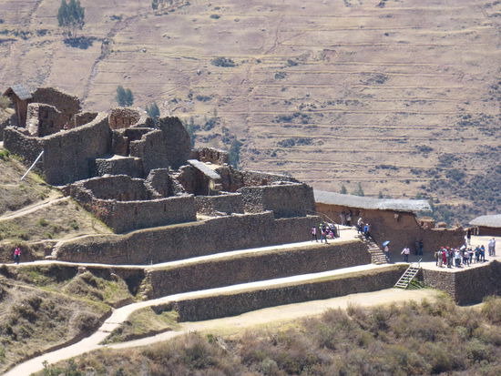 Neu für uns ist es, eine dieser Inkastätten mit einem Guide zu besichtigen, der uns eine Menge interessanter Dinge erzählt und auch die eine oder andere Ungereimtheit erklären kann. So erfahren wir zum Beispiel, dass die Inka die Steine nur dann zu dieser perfekten Passgenauigkeit verarbeitet haben, wenn es sich um heilige Stätten, oder Tempel handelt. Bei gewöhnlichen Häusern und Schutzmauern sind die Steine entsprechend ähnlich mit Mörtel verarbeitet, wie bei uns damals im Mittelalter. Schön sehen diese Ruinen natürlich trotzdem aus. Leider sind wir nicht die einzige Gruppe und so ist dieser Ort, wie auch die nächsten Stationen im Sacred Valley, ziemlich überlaufen.
