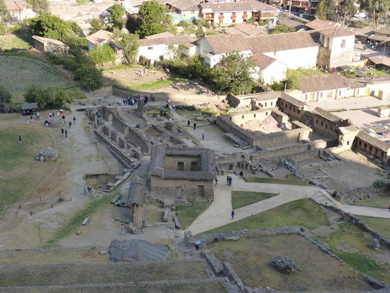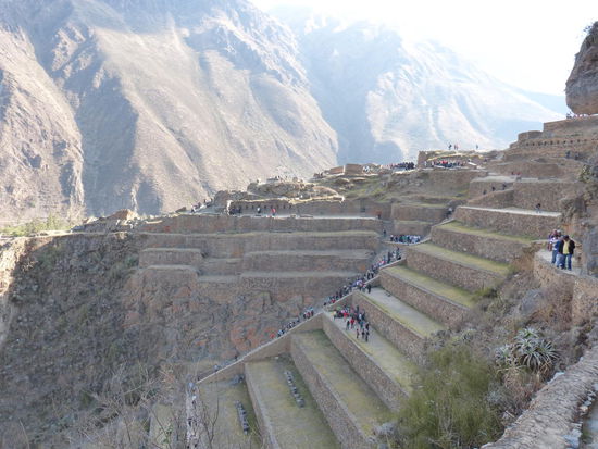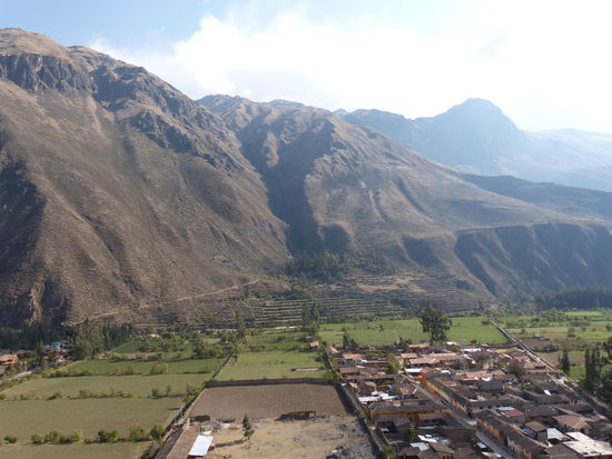 Nach dem Einchecken geht es noch einmal einen Berg hinauf, der der Inkastätte Ollantaytambo gegenüberliegt. Die Inka haben hier direkt an den steilen Berghang Kornspeicher gebaut. Nicht wirklich spektakulär, aber die Aussicht auf Ollantaytambo gegenüber und das gleichnamige Dorf unter uns ist dafür umso großartiger. Leider geht die Sonne schon hinter den Bergketten im Westen unter und wir müssen uns wieder an den Abstieg machen. Bei dem schmalen und steilen Weg kann sonst jeder Fehltritt tödlich enden. Klingt übertrieben, ist aber wirklich so.