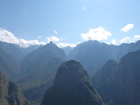 Der Versuch, wie auch schon gestern, gänzlich ohne Sonnencreme auszukommen, wird gegen Mittag, auf halber Strecke zum Sungate mit Sonnenbrand im Nacken und Gesicht abgebrochen. Über einen wunderschönen Weg durch die Natur am Steilhang entlang kommen wir schließlich zum Sungate. Wir sind hier auf gleicher Höhe mit den Besuchern von Huyana Picchu, nur genau auf der anderen Seite der Inkastätte. Der Blick von hier oben auf das umliegende Bergpanorama und das unter uns liegende M.P. ist einfach unbeschreiblich. Über eine Stunde hält die tolle Aussicht uns hier oben fest, bevor wir uns losreißen können und uns langsam wieder an den Abstieg machen.
