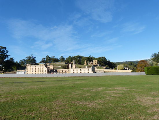 Als es dann endlich 9:00 Uhr ist, kostet uns das Ticket 35$ p.P. inkludiert aber sogar eine vollkommen überflüssige Bootstour. Außerdem ist es zwei Tage gültig, schön für Leute, die anders als wir nicht schon alles nach einem halben Tag gesehen haben. Wirklich ganz nett ist allerdings die ebenfalls inkludierte Tour, bei der man uns etwas zur Geschichte Port Arthurs erzählt. Letztlich laufen wir zwar nur über die Wiese, vollkommen an den Gebäuden vorbei, aber es geht ja schließlich um das, was der Tourguide sagt.