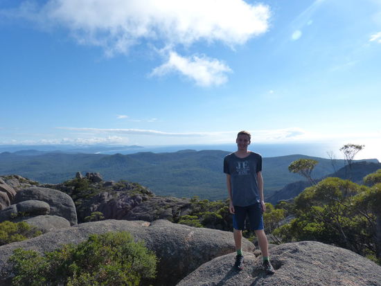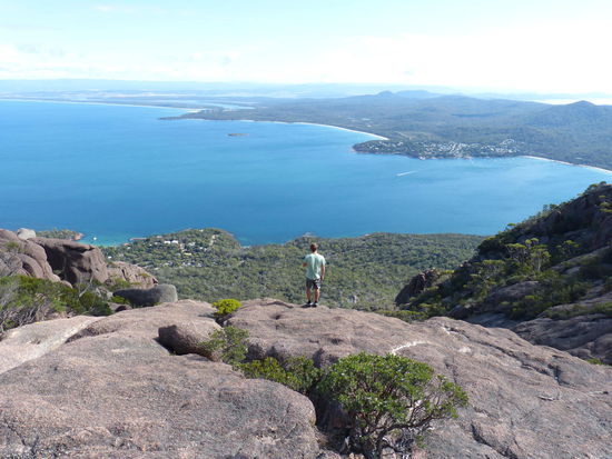 Der Aufstieg ist ziemlich anstrengend, aber zu dieser Uhrzeit ist es noch angenehm kühl und die nervigen Fliegen scheinen auch noch zu schlafen. Bei Nässe sollte man den Aufstieg in jedem Fall vermeiden und Leute mit Höhenangst bleiben auch lieber auf den anderen Wanderwegen, denn wie man hier teilweise a uf allen Vieren am glatten Fels hochkriechen muss, während es hinter einem locker 50 Meter steil hinunter geht, ist schon ziemlich heftig. Zwischendrin fließen immer wieder kleine Rinnsale über den Weg, damit man mit seinen feuchten Sohlen beim nächsten Schritt auch ja keinen Halt findet und nur ein beherzter Griff nach einem mickrigen Strauch weiteres Abrutschen verhindern kann. Doch ist man erstmal oben angekommen, was bei uns sogar schon nach einer guten Stunde der Fall ist, vergisst man jeden schwierigen Schritt des Aufstieges. In alle Richtung ist die Fernsicht einfach nur atemberaubend und der Blick von hier oben auf die Wineglassbay lässt den Lookout von gestern fast schon wie einer Farce wirken.