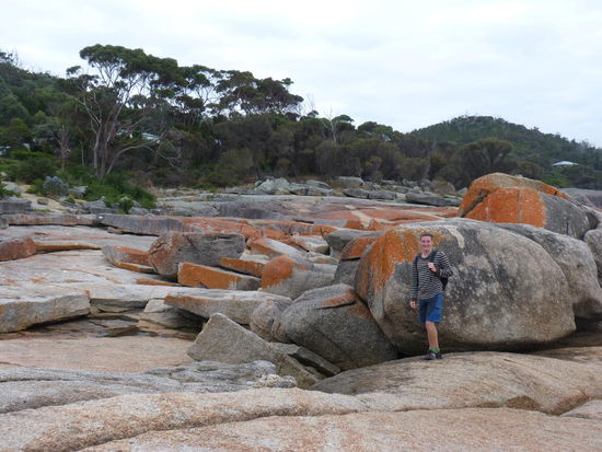 Die Sonne geht auf, wir sind wach und mit uns auch ein Wallaby und eine Gruppe australischer Rehe oder dergleichen, die allesamt panisch Reißaus nehmen als wir mit unserem kleinen roten Auto über den Feldweg vorbeituckeln. Auf dem Weg zum Freycinet-NP wird noch schnell an einem so genannten Blowhole gehalten, bei dem jede zweite Welle so in eine Felsspalte gedrückt wird, dass das Wasser in einer Fontäne nach oben schießt. Gerade in Verbindung mit den Geräuschen des Meeres ganz nett anzusehen. Was bei mir die Stimmung leider etwas drückt, ist die Tatsache, dass gerade alle Pinguine unterwegs sind, oder auf dieser blöden Insel im offenen Meer hocken und ich sie deshalb nicht aus der Nähe sehen kann.