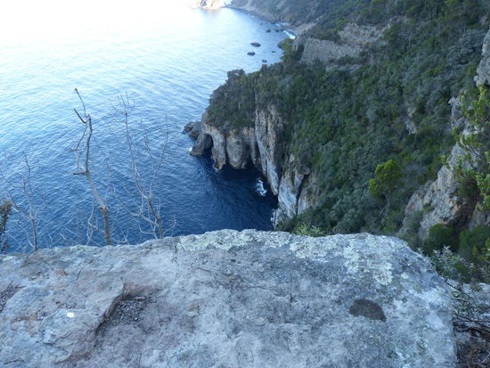 Dafür gibt es wieder einen sensationellen Aussichtspunkt, bei dem wir beide froh sind, einander vertrauen zu können. Einmal schubsen und kein Mensch würde über hundert Meter tiefer auch nur irgendwelche Reste des anderen in der Gischt des tosenden Meeres direkt unter uns finden. So aber kauen wir im Gesicht den Wind der Freiheit genießend an unseren 5$ Sesambrötchen, die wir kaufen mussten, weil unsere Vorräte alle waren. Weit, weit unter uns treiben derweil ein paar Seelöwen einen panischen Fischschwarm zusammen und fressen sich nach erfolgreichem Beutezug zufrieden daran satt. Wirklich ein schöner letzter Abend auf Tasmanien.