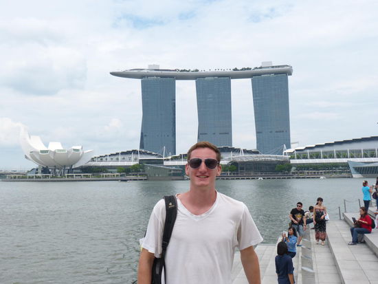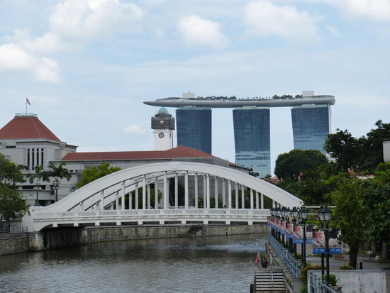 Von hier aus hat man dann auch einen schönen Blick auf das relativ neue "Marina Bay Sands" Hotel und Casino, das aussieht, als würde ein riesiges Schiff auf drei Hochhaustürmen thronen. Laut Wikipedia handelt es sich dabei mit Bau- inklusive Grundstückskosten von über 4,5 Mrd. € um die teuerste alleinstehende Casinoanlage der Welt. Wie gesagt, optisch ein absoluter Wahnsinn. Mit der Skyline des Bankenviertels hinter uns verhält es sich dann ähnlich wie damals in Manhattan, dass selbst zweihundert Meter hohe Wolkenkratzer sich im Hochhausdschungel einfach verlieren und wir jedes Gefühl für Größe verlieren.