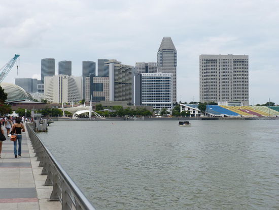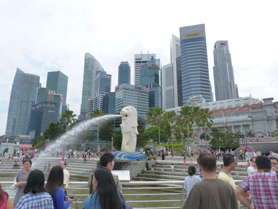 Da heute Sonntag ist, ist hier im Bankenviertel, wo wir die MRT verlassen, entsprechend wenig los. Aber Hochhäusergucken kann man schließlich auch ohne umherwuselnde Angestellte. Wirklich fußgängerfreundlich ist die Gegend zwar nicht, weil das Überqueren der Straßen nur an bestimmten, zum Teil schwer zu erreichenden Stellen möglich ist, aber irgendwann kommen wir schließlich doch noch zum Ufer der Marina Bay, wo aus dem Maul einer Löwenschrimp-Fusion zur Begeisterung der Menschenmassen Wasser ins Meer spritzt. Sensationell.