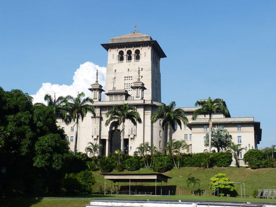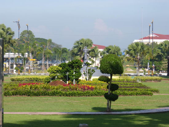 Bevor es heute gleich weiter nach Malakka geht, wollen wir uns wenigstens noch ein paar Sehenswürdigkeiten in Johor ansehen, was sich allerdings schwieriger gestaltet als erwartet. Auf der Hauptstraße geht es erstmal Richtung Süden, bis zum Meeresarm, der Johor von Singapur trennt. Wohnhäuser gibt es hier irgendwie kaum, dafür aber riesige Hotels, Militär- und Verwaltungsgebäude und einen Palast, der ein bisschen an eine Ritterburg mit riesigem Bergfried erinnert. Unserer Meinung nach das mit Abstand schönste Gebäude in Johor, wirklich sehr imposant, wenn auch leider sehr weiträumig abgesperrt. Malaysia ist übrigens zu 60% muslimisch, eine Erklärung, weshalb es zumindest bis jetzt wesentlich weniger asiatisch wirkt als erwartet. Eine schöne Küstenstraße gibt es leider auch nicht, weil das Meer, damit man nicht nach Singapur rüberschwimmen kann, abgezäunt ist. Auf der anderen Straßenseite endet der Fußweg dann auch nach wenigen hundert Metern und auf der hilflosen Suche nach dem Sultanspalast kommen wir nur noch an irgendwelchen offiziellen Grundstücken vorbei, auf denen man laut Ausschilderung erschossen wird, wenn man sie betritt. Na sehr schön.