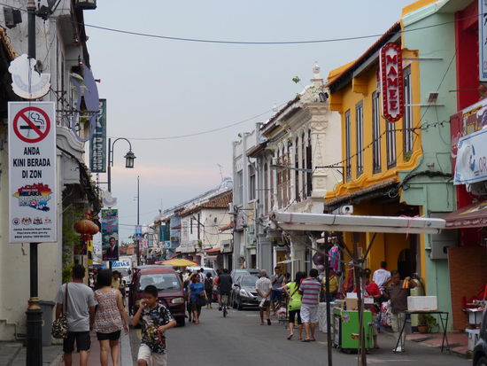 Auf der anderen Seite des Flusses geht es dann in die Jonker Street, die vor allem wegen ihres Nachtmarktes bekannt ist. Das gesamte Viertel ist wirklich sehr schön mit den schmalen Straßen und den vielen Kolonialbauten, die so völlig im Widerspruch zu den vereinzelten chinesischen Tempeln stehen. Aber gut, dieses Viertel ist eben nicht umsonst auch als Chinatown bekannt, weshalb es für uns dann auch gleich erstmal Gemüse und Fleisch in schwarzer Pfeffersoße nach chinesischer Art gibt. In der Jonker Street herrscht auf dem Rückweg bereits großer Trubel in Vorbereitung für den Nachtmarkt und wir beschließen, nach Einbruch der Dunkelheit auf jeden Fall noch mal herzukommen. Also geht es wieder zurück zum Hotel, Cola trinken, Kekse essen, Füße ausruhen und schon wieder los, zurück ins Zentrum und zur Jonker Street, wo inzwischen dichtes Gedränge um die vielen Stände herrscht. Schmuck und Souvenirs sind für uns jetzt nicht ganz so spannend, wie das Kulinarische, weshalb wir die Straße zum Angucken erstmal bis zum Ende durchlaufen. Wer hätte gedacht, dass es hier sogar doch noch einige andere europäische Touristen gibt?