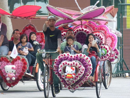 Über eine breite Fußgängerzone, in der man ständig pink geschmückten Hello Kitty Fahrradkutschen ausweichen muss, geht es dann weiter in die Innenstadt, zum zentralen Kreisverkehr, an dem wir auch die Touristeninfo antreffen, die sich allerdings gerade in der Mittagspause befindet. Da bei der Wärme jetzt noch anderthalb Stunden ohne Karte rumlaufen auch wenig Sinn macht, geht es also erstmal wieder zurück ins Hotel, ein bisschen rasten.
