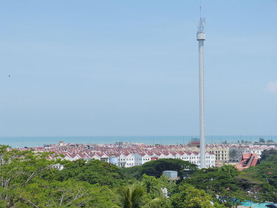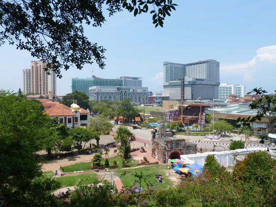 Nach dem Essen geht's dann zu Fuß zur auf einem Hügel im Zentrum gelegenen St. Pauls Church, von der zwar nur noch die Grundmauern übrig sind, aber der Blick von hier oben ist echt schön. Mit seinen vielen alten Kolonialbauten aus der englischen Besatzungszeit erinnert Malakka fast ein bisschen an die Altstädte in Südamerika. Insgesamt ist Malaysia bis jetzt erstaunlich reich und wirkt wenig asiatisch. Am Fuße des Hügels steht das Porta de Santiago, welches zwar ganz nett aber auch nicht so spektakulär ist.