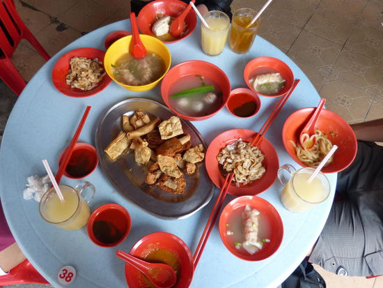 Vor den Shoppingtouren geht es aber erstmal Mittag essen. Es gibt Suppe, schleimige Nudeln, die ein bisschen an Regenwürmer erinnern, aber ansonsten sehr lecker sind und allerhand in Teig gewickeltes Frittiertes. Zum Beispiel vegetarische Ente, was absolut lächerlich klingt, aber tatsächlich nach Ente schmeckt. Wirklich sehr lecker alles, wenn auch eher chinesisch als malaysisch.