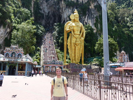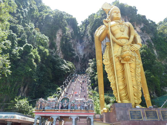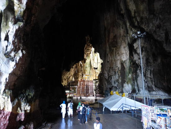 Die Höhle selbst muss man sich dann weniger als Höhle sondern eher als Grotte vorstellen, in die von zwei Seiten aus Tageslicht einströmt. Ist aber wirklich schön, wenn man dann nach dem Durchqueren plötzlich wieder unter freiem Himmel steht, der in fünfzig Meter über einem durch das riesige Loch im Berg zu erkennen ist. Eine kleinere, aber längere Höhle kann man nur mit erstaunlich teurer Führung betreten. Aber auf irgendeine exotische Spinnenart, die dort lebt, und anderes großes Ungeziefer haben wir jetzt auch nicht so viel Lust. Da genießen wir schon lieber den heute wirklich klaren Blick über Kuala Lumpur mit der alles überragenden Silouhette der Petrona-Towers und dem Fernsehturm.