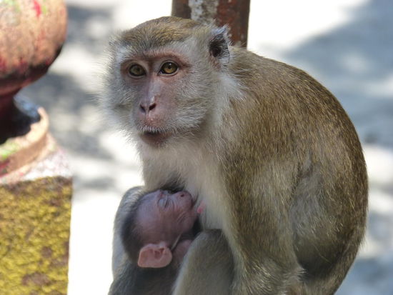 Vom Bahnhof aus geht es zuerst an ein paar bunten Tempeln und Teichen vorbei, bevor der eigentliche Eingang der Höhle ins Blickfeld kommt. Eine riesige vergoldetet Buddhastatue thront hier direkt neben den unzähligen Treppenstufen, die einen hinauf zur Haupthöhle führen. Zum Glück liegen die Stufen im Schatten des riesigen Felsen. Wirklich ein imposanter Anblick. Auf dem Weg hinauf ist dann wieder Obacht geboten, um nicht von einem der unzähligen Affen beklaut zu werden, die auch das letzte bisschen Angst vor den Menschen verloren haben.
